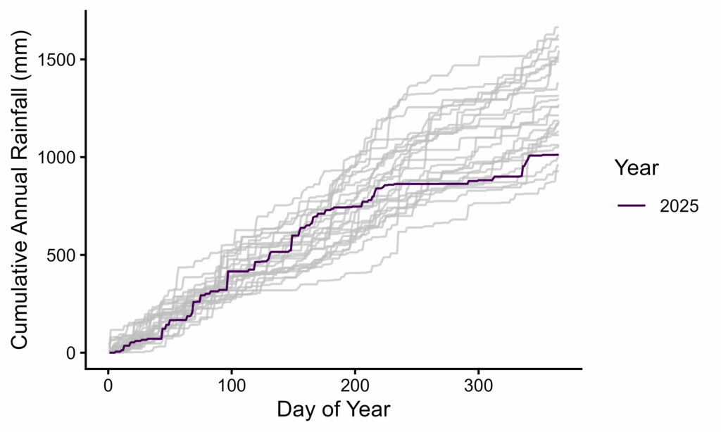 Happy New Year from the Aquatic Sciences Lab! The lab celebrates our first-year anniversary this month and we are looking both backwards at a busy 2024 and forwards to an exciting 2025. We will be making our way to you at conferences and welcoming new lab members and graduate students (more to come soon!). As we reflect on 2024, we look back on the year in rainfall. Maybe this becomes a recurring post around the beginning of the year? Maybe we evaluate a different measurement that we (or our collaborators) make continuously throughout the year? But for today… Rainfall Wrapped! The Jones Center collects rainfall in a few locations and in collaboration with various partners. Rainfall is collected by the Ecohydrology lab at climate stations and in various wetlands across the property. They use wetland rainfall collectors to precisely determine water budgets, which is a challenge for our many tiny