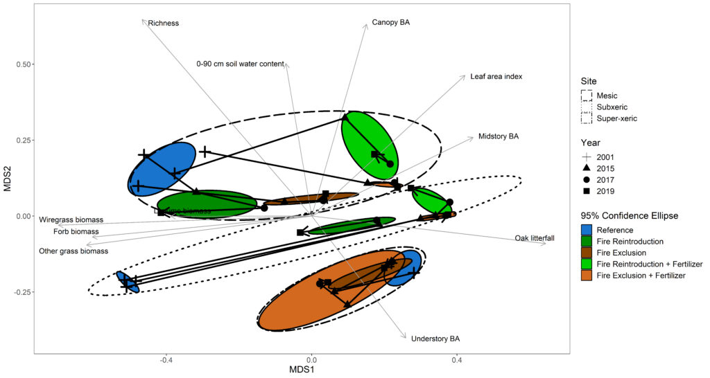 The Plant Ecology, Ecohydrology, and Ecological Silviculture Labs collaborated on a recent publication utilizing the Jones Center’s Long-term Productivity project. We found that: •Recovery in species composition was more evident at wetter sites compared to drier sites, likely because of seed establishment limitations at the drier sites. •A legacy of fertilizer addition dampened species richness and community recovery trajectories. •Recovery in species richness was most evident at larger (≥10 m2) spatial scales.